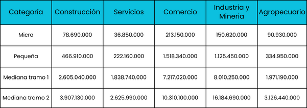 Aquellas empresas cuya actividad principal declarada ante la AFIP no sea alguna de las detalladas en el siguiente cuadro, podrán inscribirse en el Registro de Empresas MiPyMEs siempre que sus valores de ventas totales anuales expresados en pesos no superen los topes: