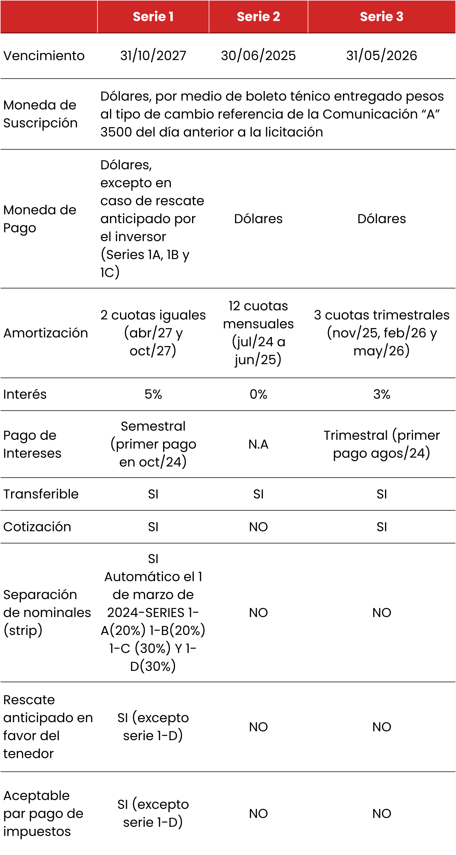 -Mercado secundario: en el anuncio de la subasta se definirá si estos instrumentos se negociarán o no en los ámbitos de BYMA/MAE, y mercados euroclearables. Al igual de que si podrán o no ser utilizadas como colaterales para operaciones de REPO.