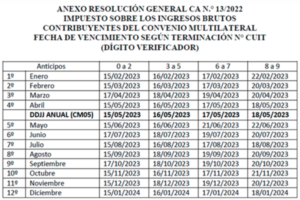 Por medio de la Resolución General 13/ 2022 (B.O. 14/12/2022) CA-CM se establecen las fechas de vencimiento para la presentación y pago de las DDJJ del impuesto sobre los ingresos brutos para el período 2023 correspondiente al universo de contribuyentes que liquidan el gravamen bajo las normas del Convenio Multilateral.