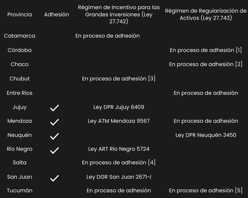 Te informamos hasta el momento, que provincias se encuentran adheridas o en proceso de adhesión al Régimen de Incentivos para Grandes Inversiones (RIGI) establecido en la Ley de Bases y al Blanqueo, régimen de regularización de la Ley de medidas fiscales 27.743.