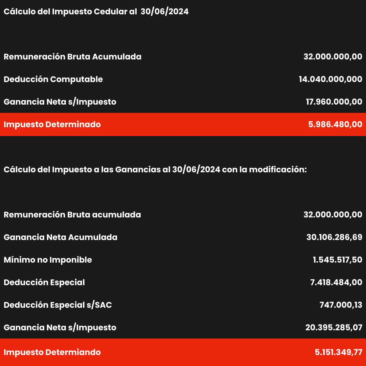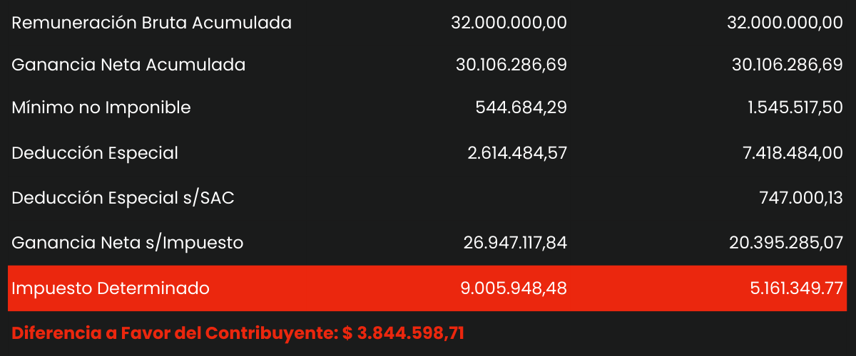 En este caso, se produce un incremento de la obligación fiscal. La diferencia se produce porque el Impuesto Cedular tiene previsto un ajuste de la deducción de 15 Salarios Mínimos Vitales y Móviles (SMVM) por el valor vigente al mes de julio, en consecuencia, el piso mensual de $ 2.340.000 se eleva a $ 3.514.726,50 provocando un re cálculo del impuesto. Cabe aclarar que este supuesto va a producirse como consecuencia de las liquidaciones de sueldos que al día de hoy están cerradas, sin embargo, la diferencia no debería devolverse considerando que la Ley 27.725 señala que la AFIP deberá establecer las modalidades y plazos de la restitución de las sumas retenidas en exceso y al día de la fecha no hay reglamentación que lo contemple.
